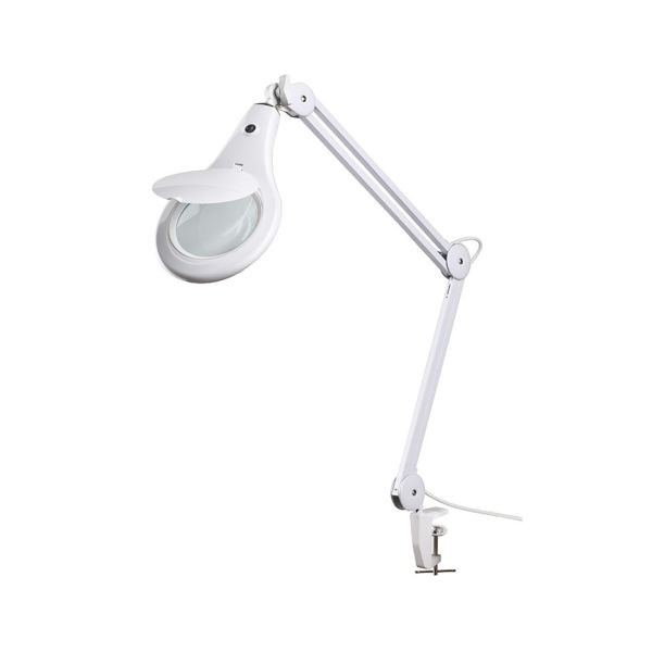Laboratory lamp for jewelry and watch making. Cold light that doesn’t tire the eyes, magnifying glass with good optic quality. Fastening clamp on work bench.